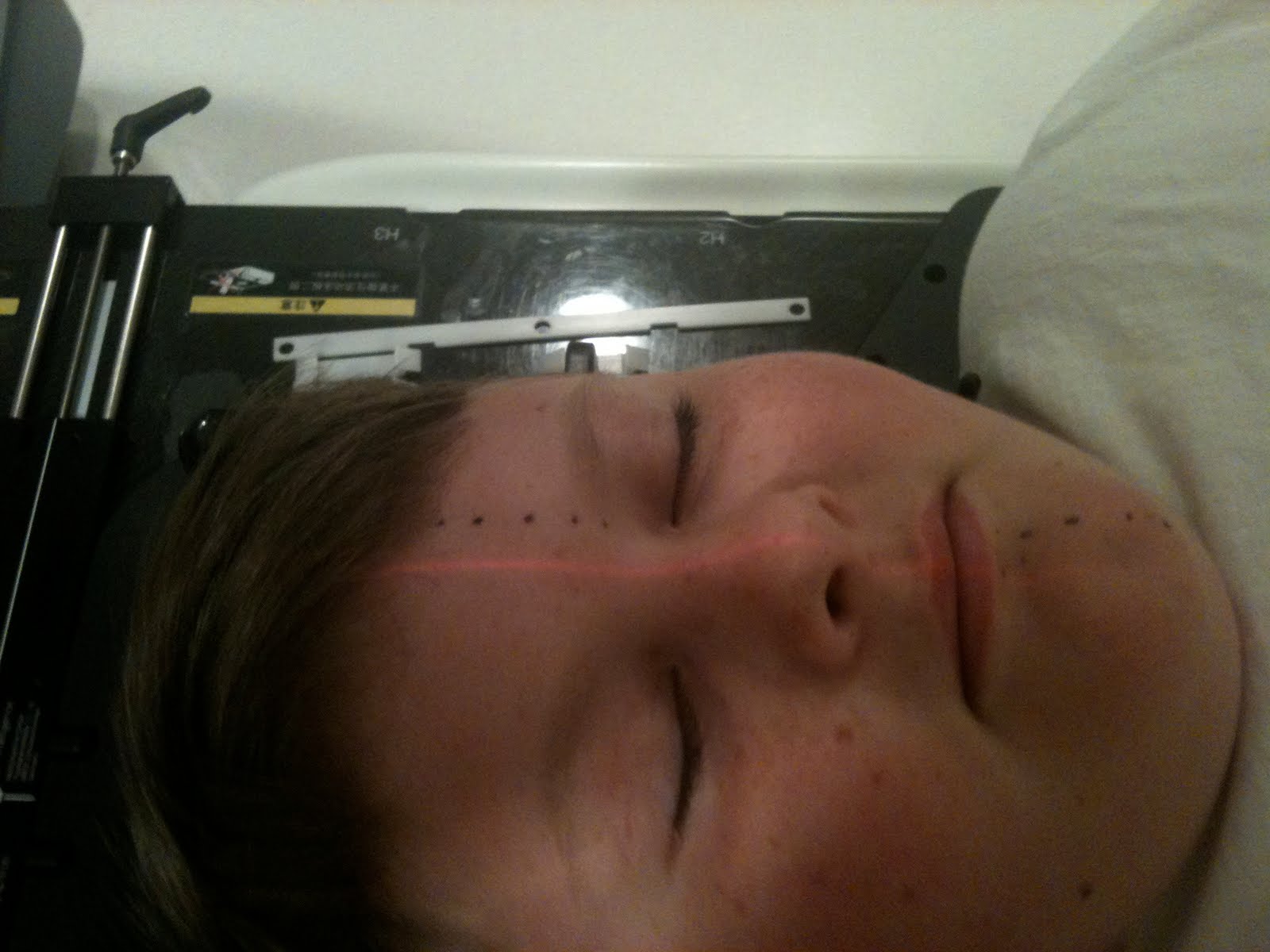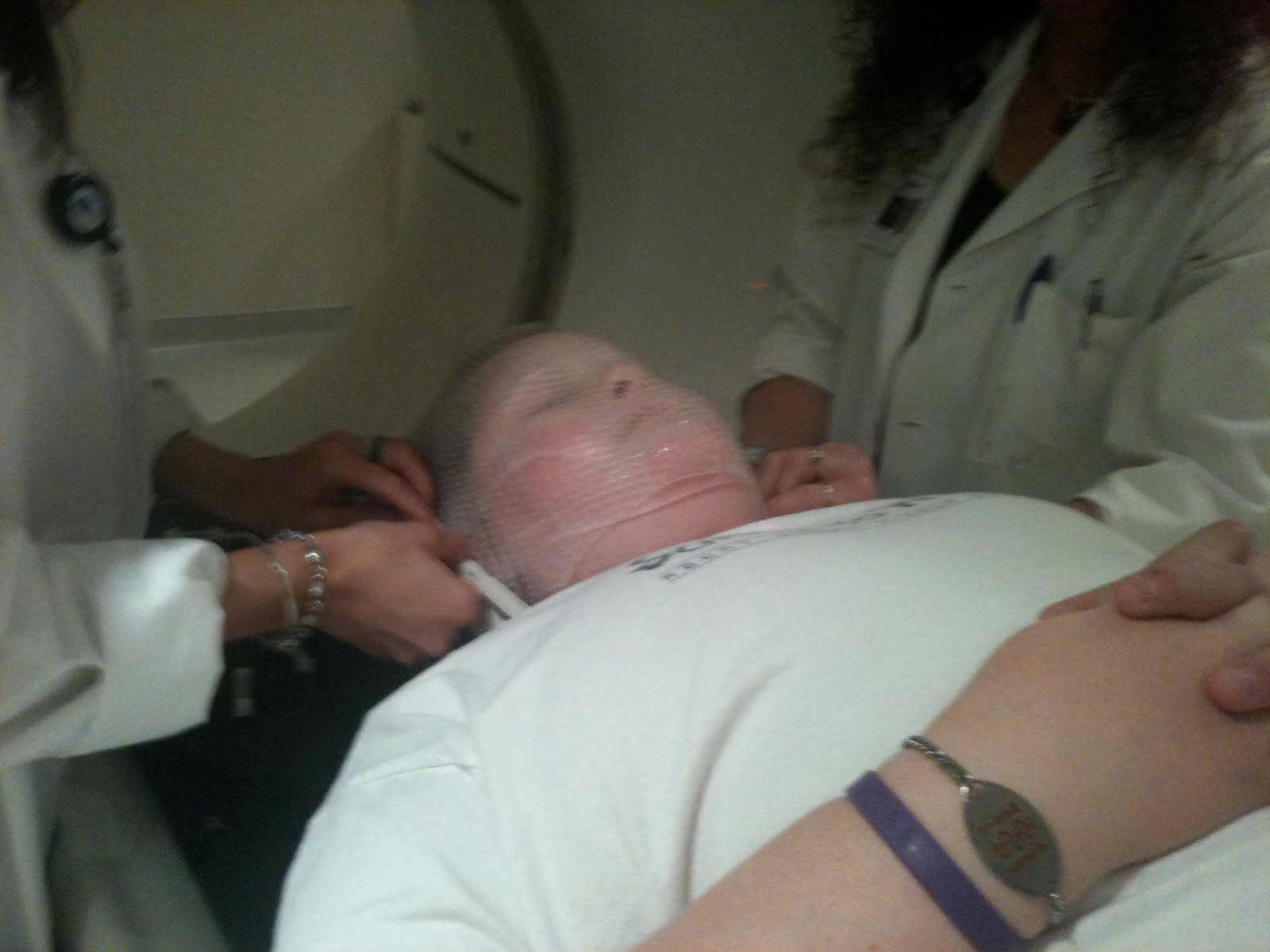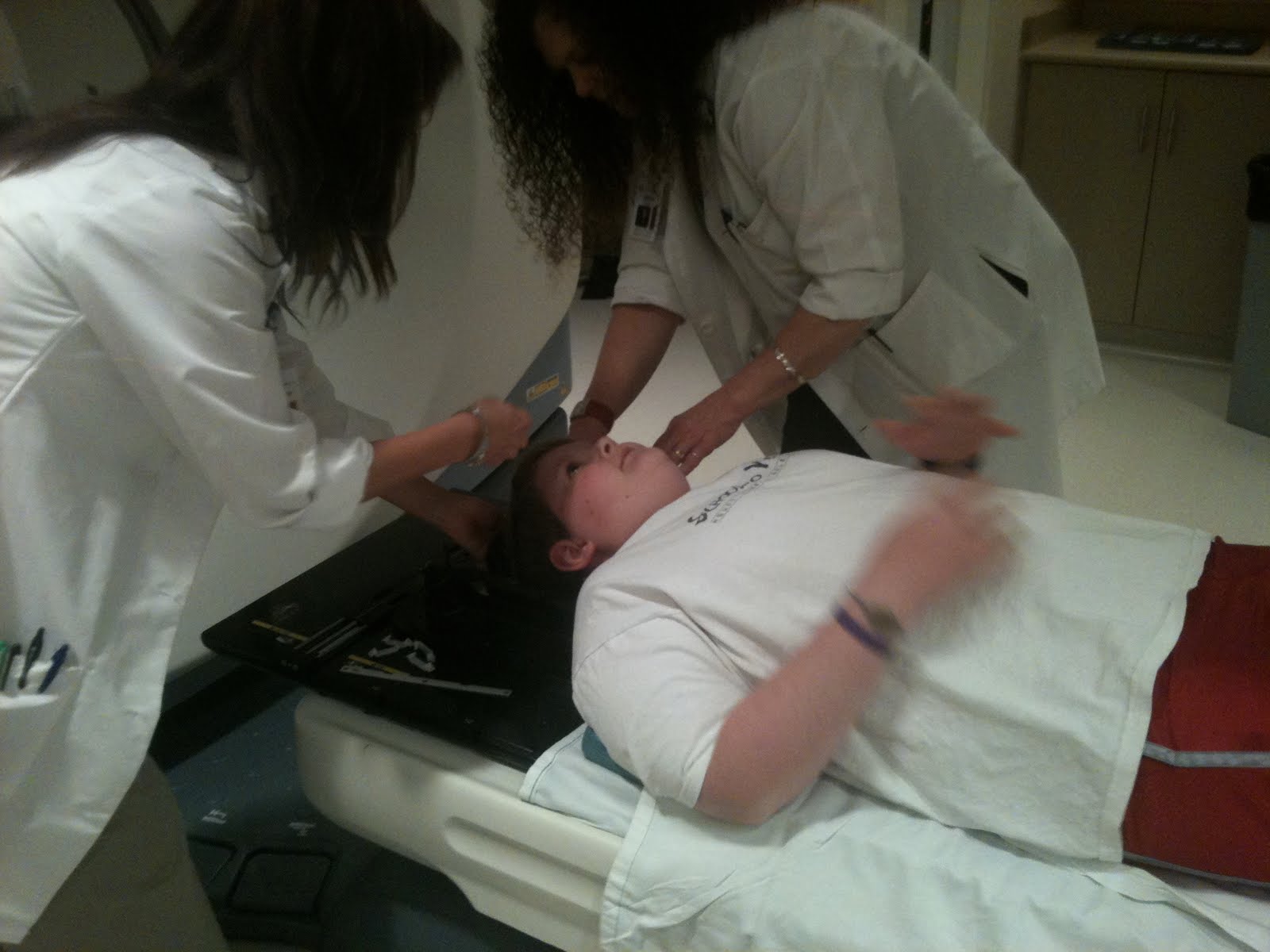 Pharmacokinetics Study. It measures the amount of chemotherapy in the blood before taking the drug and then again 1 hour, 2 hours, 4 hours, and 8 hours after taking the drug. Matt is in a phase 1 trial and phase 1 trials are all about correct dosing and what side effects occur with the drug. After we began the test, Matt started seeming a little strange. He was complaining of an earache and he was hungry since he had to fast for 2 hours before chemo and 1 hour after. We finally got him a bowl of cereal after the 2nd blood draw and then went for our clinic visit. In clinic, Matt began really, really acting poorly. He said his ear REALLY was hurting and he began to cry - very unlike him. The clinic doctors and nurses kicked into gear and began doing tests. Lots and lots of tests. While we waited for the results, they decided to start Rocephin via IV. He laid down on the bed and as soon as they started the antibiotic, he began vomiting. Again, he didn't seem 'sick', but something was very wrong.