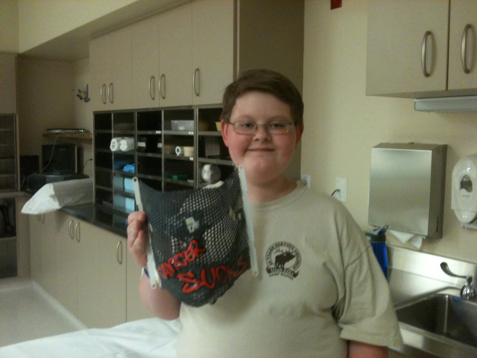 When you or I are in a stressful situation or we are ill, our body makes adrenalin. We make a little bit every day, but in times of stress our bodies make a lot. Matt's body doesn't make ANY and it is the most life threatening, on a day to day basis, thing we deal with. Between the travel and subsequent dehydration and the illness, it put him over the edge. Thankfully, we were in the hospital at the time. They gave him an IV stress dose of cortisol and decided to admit him. They wanted to watch him closely. They also wanted to get the results back from all the tests. Because of his symptoms (vomiting, diarrhea, sore throat, cough, earache) they put him in a 'strict isolation' room. Every time anyone came into the room they had to put on a full gown, mask and gloves. Matt was not allowed to walk around the unit, and I had to scrub my hands in a special sink right outside his room whenever I walked out.